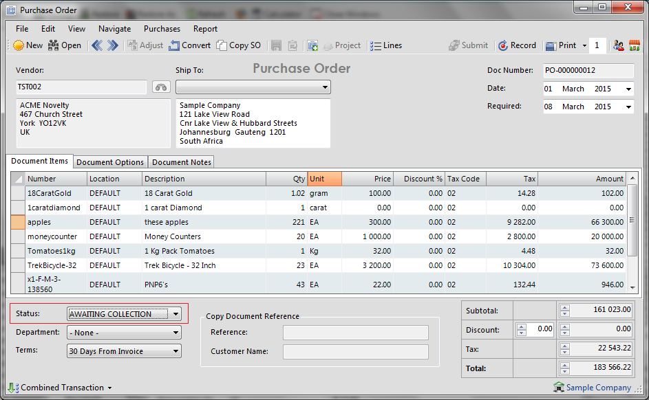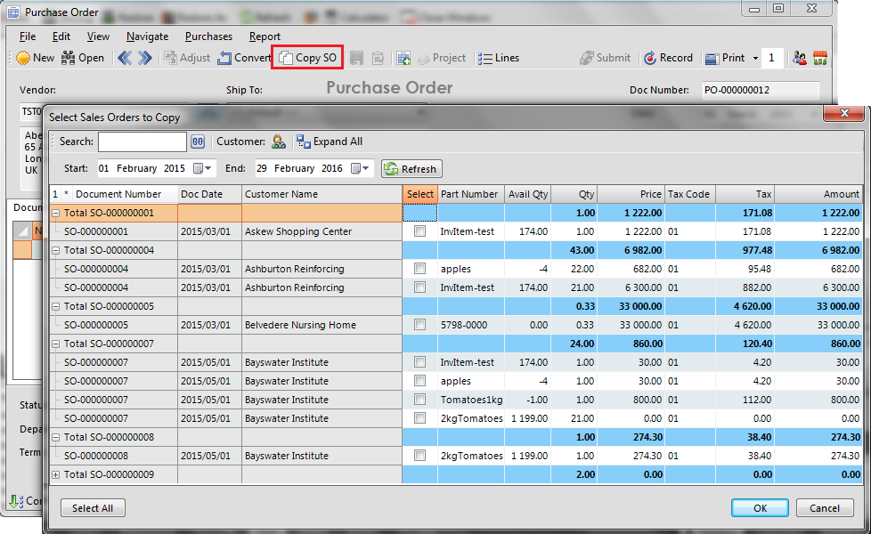 This feature allows you to create Purchase Orders by copying over the details of one or more Sales Orders to the Purchase Document. When the goods are received the system will also detail the Sales Order details at time of processing the Goods Received Voucher in order to expedite the fulfilment of the order. This is particularly useful in handling buyouts with the Sales Order details taken through to the Purchase Document catering for full traceability from Cradle to Grave.