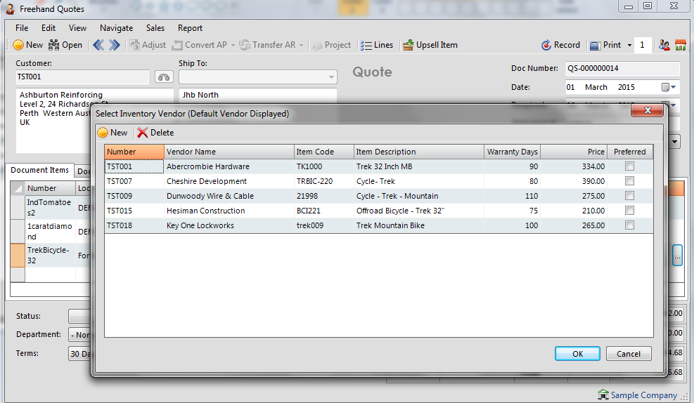 Palladium allows you to maintain a number of Vendor Pricing per item, maintaining the Vendor’s Code, Description, Price and Warranty. In addition you can use these intelligently when selecting a Vendor on creating a Purchase Document on the Fly using the Freehand Quotes function found in the Accounts Receivable section.