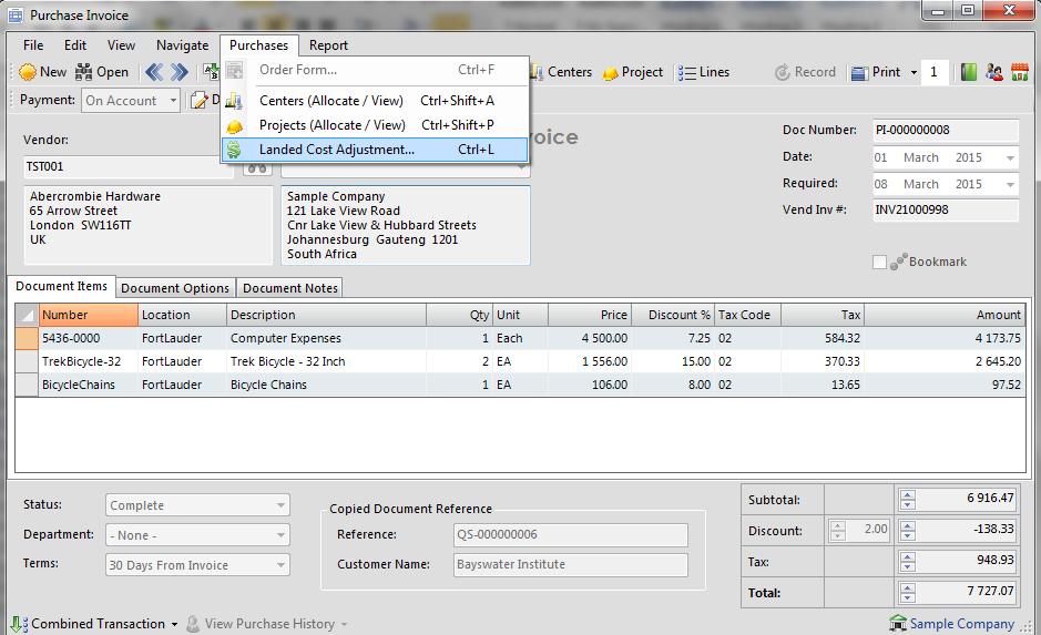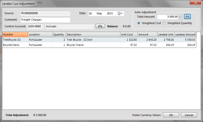 You can assign an unlimited number of additional costs to a specific goods received batch. Costs can be apportioned proportionately by the total shipment Quantity or Value, or can just be assigned manually as required. In addition the additional costs are accrued to a provision account allowing you to even assign charges with or without and Additional Cost invoice from a Vendor.