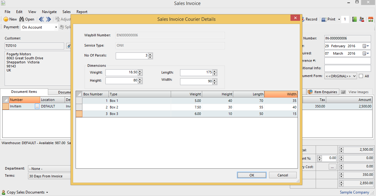 Integrate invoices directly to Dawn Wing Courier company, with the system allowing you to create standard shipping box sizes and dimensions for ease of use.