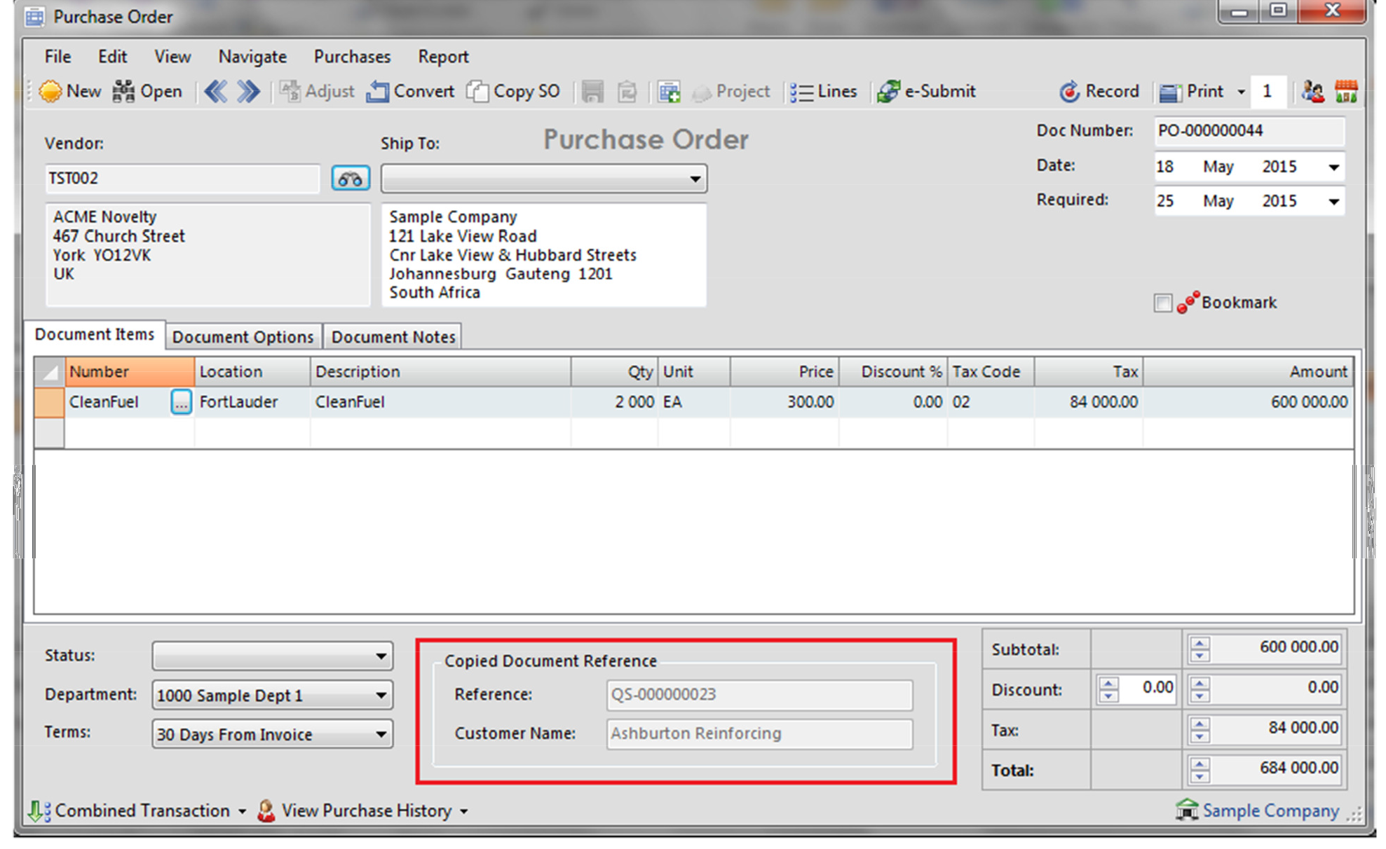You are able to view Vendor History at a glance on all processing documents with the ability to copy these items onto the processing document with one click. The ability to Bookmark documents for quick reference gives you the ability to copy items from one document to any other document in seconds. This could be used to copy items from a Purchase order to a Customer Invoice or vice versa. To View a support article on the Bookmarking of documents click here. To view the article on looking up Customer Order/Sales, and Supplier Order/Purchase information, and copying this to the current processing document click here.
