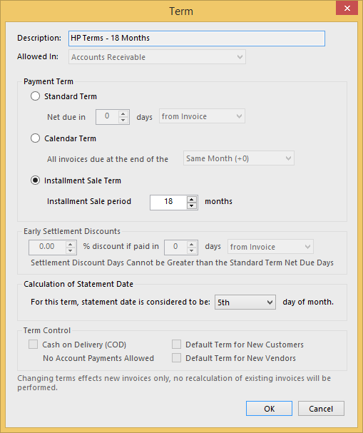 Our flexible terms feature allows you to define negotiated terms on a per document basis, either from date of invoice or from date of statement for both Customer and Vendor invoices.