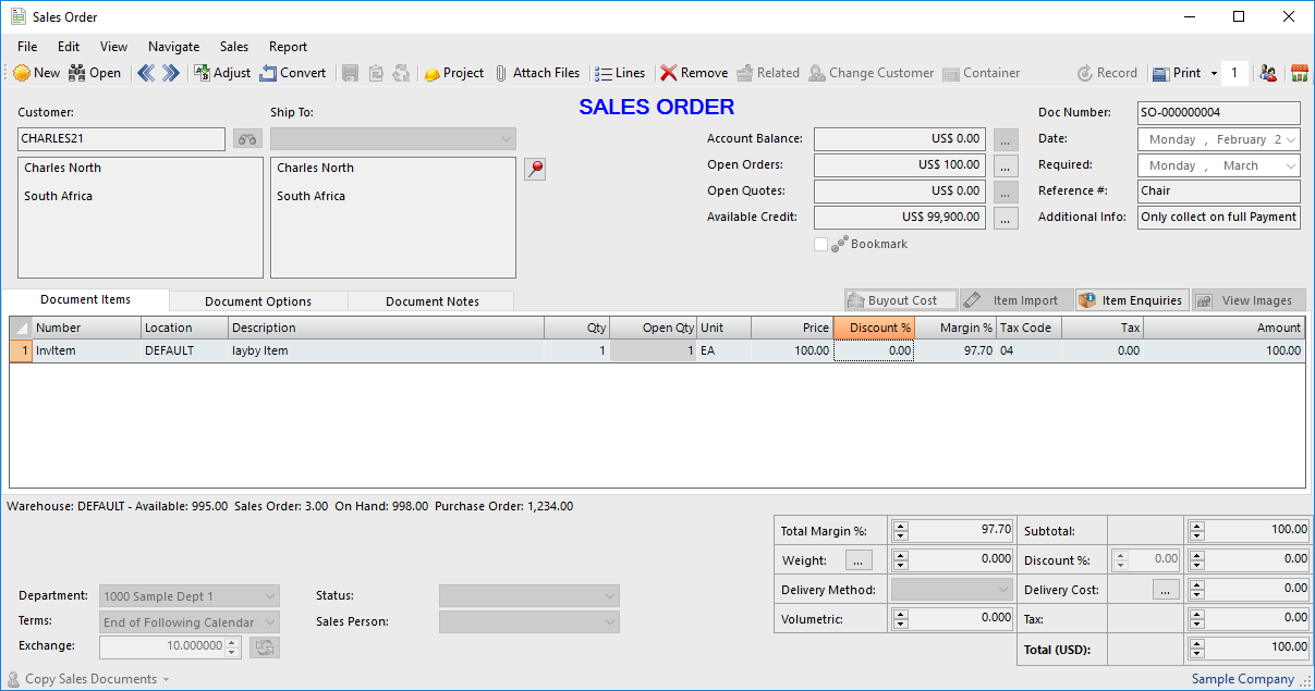 This is an optional setting, per user, that allows you to view the Gross Margin (Gross Profit as a % of Sales) per line item, as well as a total per document, allowing you to negotiate pricing on a real-time basis. We have also added the ability to display the cost as the Standard Cost / Last Received Cost / Moving Average (summary) / Moving Average per Location / Greater of the Last Received Cost or Moving Average Price.