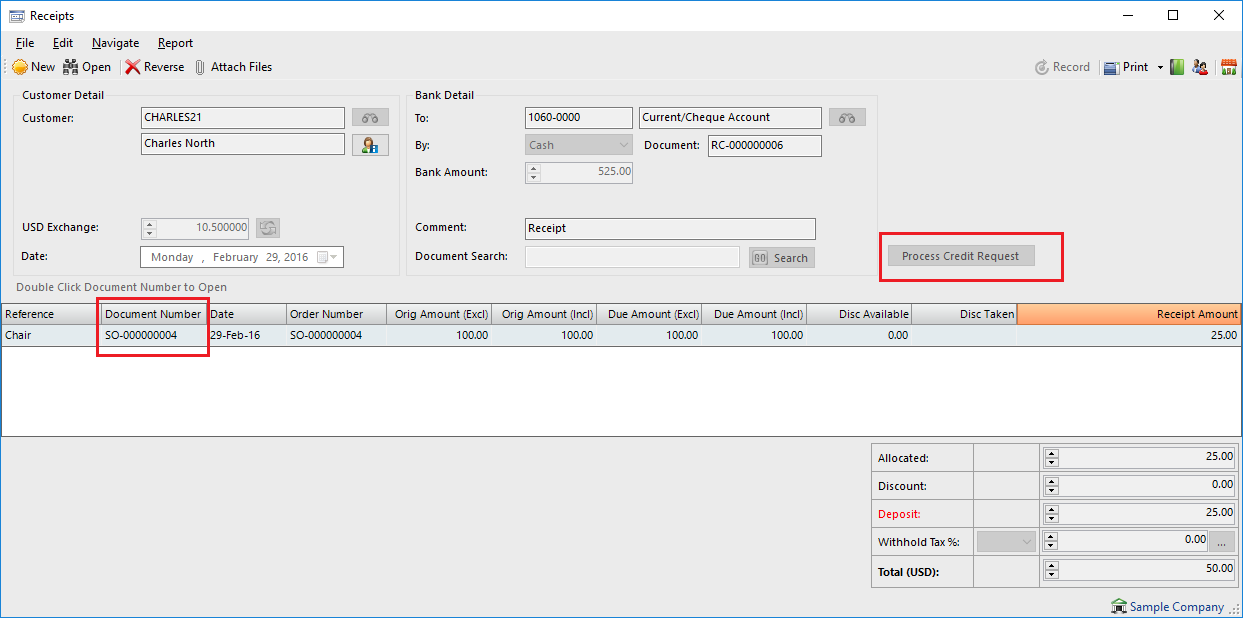Create credit requests to ensure that all returns are correctly managed. Credit requests can be created on the fly during receipt processing.