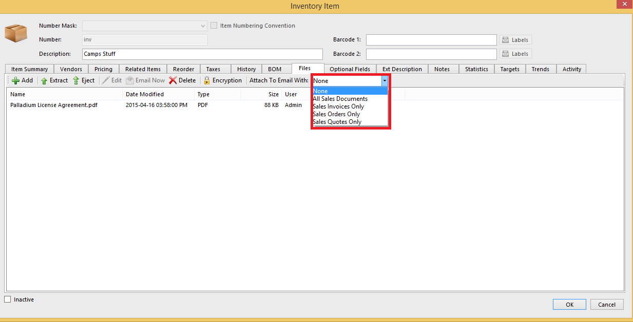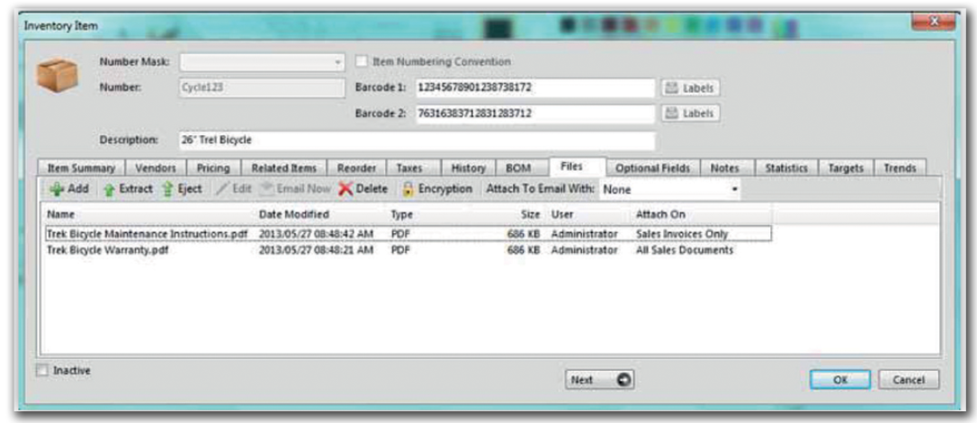 You can attach related files on the fly with emailed sales documents. When setting up inventory item file attachments, you can set whether the document is auto-mailed with the relevant sales document, such as invoices, orders etc, and when the sales document is created, all related documents are attached and sent accordingly. This information could be installation instructions, manufacturing certificates, warranty information or even a sales document recommending related items.