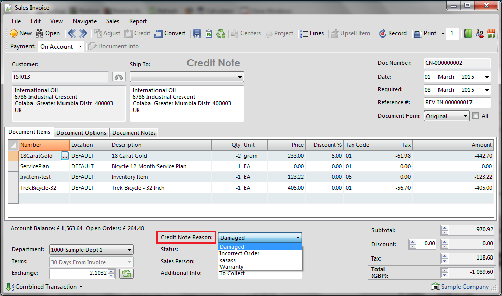 The Credit Note Authorisation facility allows users to Create a Credit Note Request form and have this authorised before being converted to a credit note. Credit Note reason codes complete this function by allowing you to further analyse the return reasons themselves.