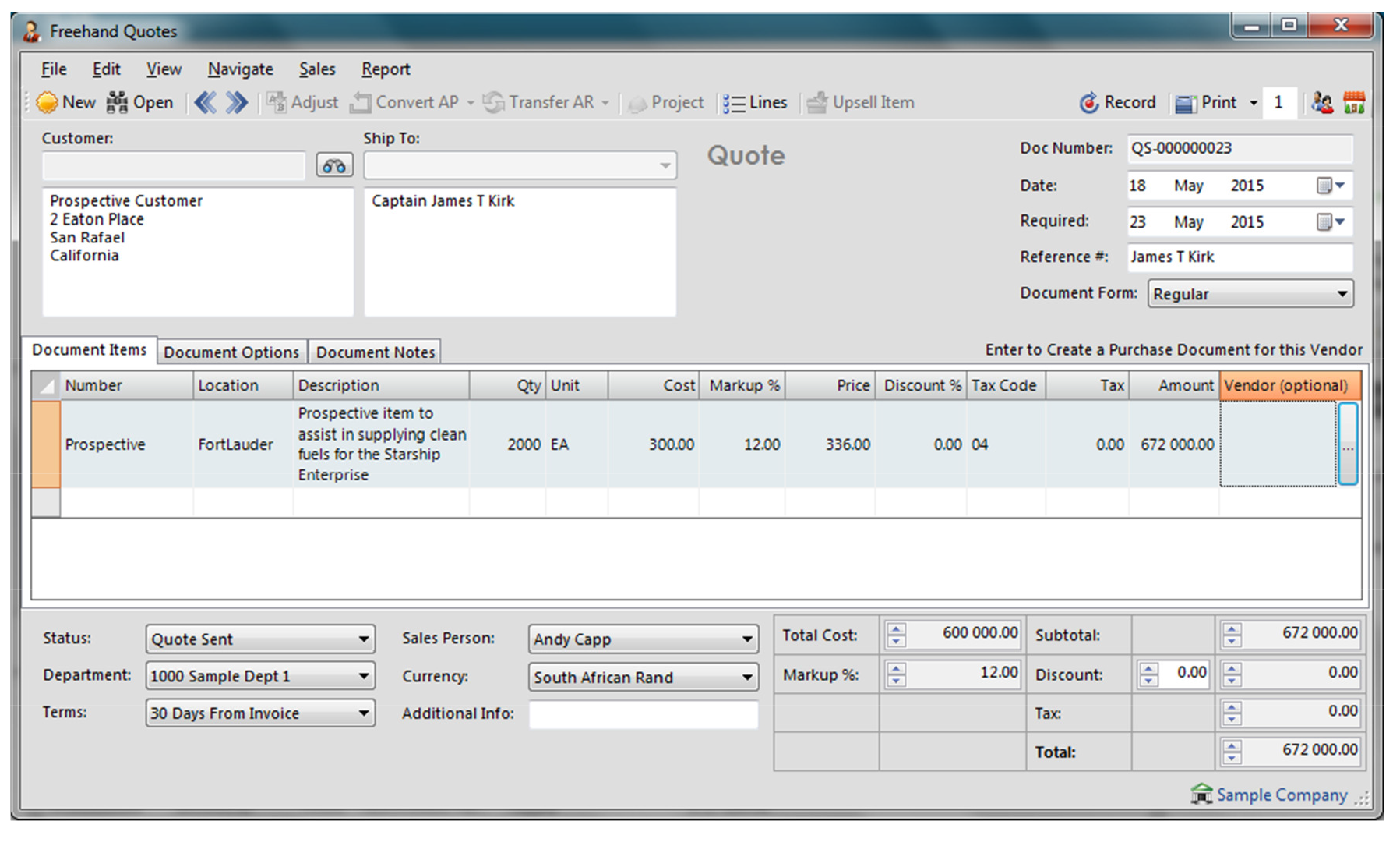 Freehand Quotes allows the creation of quotes for prospective clients without having to create a customer masterfile, or inventory records. Set margins, select Vendors and create simultaneous Purchase and Sales documents all from the same screen, ideal for tenders and the related approvals.