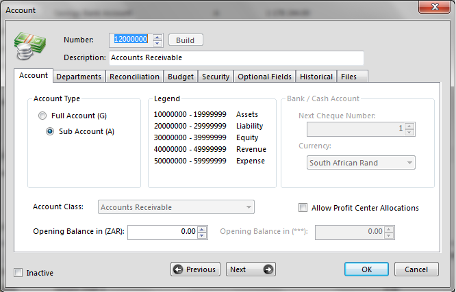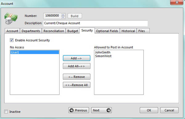 Our General Ledger caters for Main and Sub-Accounts as well as full departments or branches and also has full cost centre allocations for a complete multi-dimensional reporting view of your business. In addition each General Ledger Account has the option to be Reconciled for accounts such as provisions or accruals with user account security set per General Ledger Account. This roll-up security feature even stops staff from invoicing items whose sales or cost accounts are disallowed at General Ledger level.