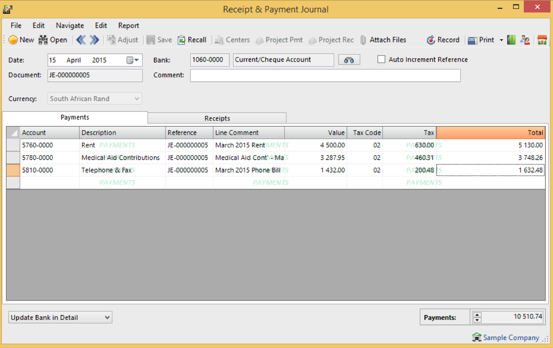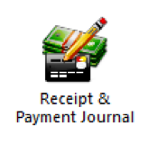 The Receipts and Payments Journal is donated by the icon underneath, and is found in the General Ledger Section, the main as well as the Main section under processing items, and is also located in the Cashbook function in the Business section of the application.